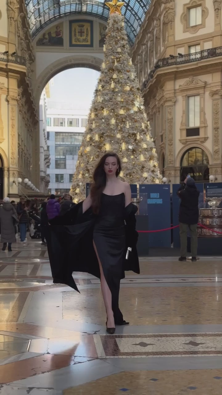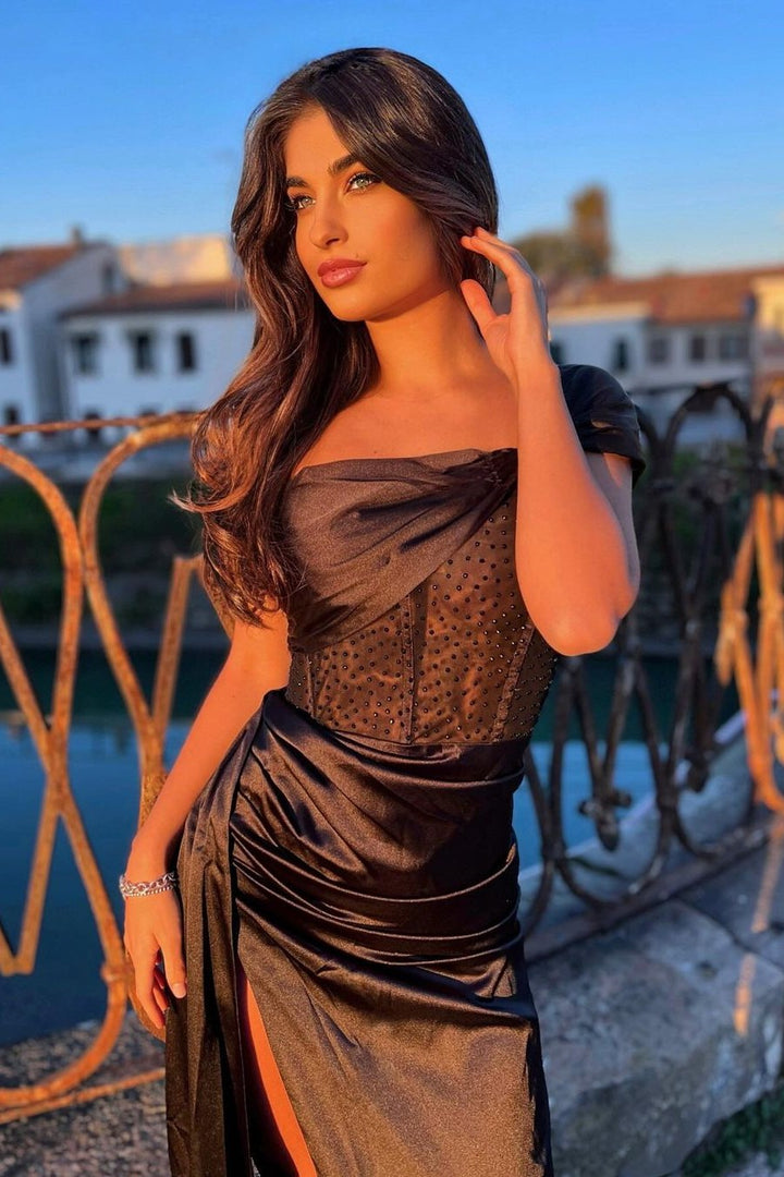 Colia Diamante Mesh Corset Satin Maxi Dress - Black