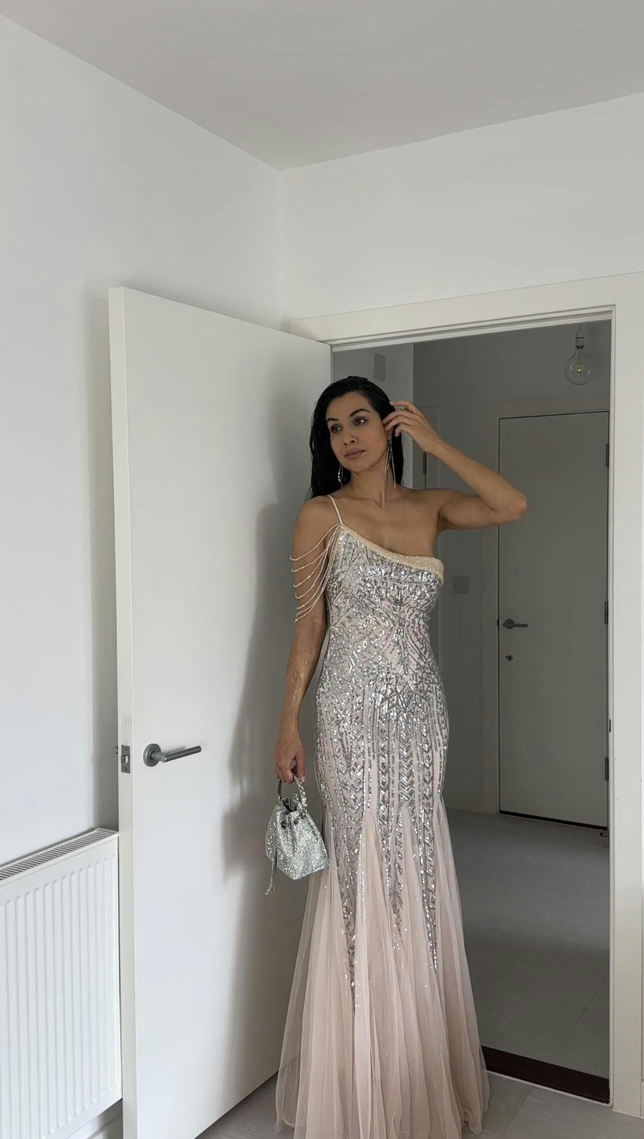 Experience the fusion of luxury and radiance with our Elay Gold One-Shoulder Sequined Fishtail Dress, crafted for ultimate glamour! The dress shines brightly with its luxurious gold sequins, adorned in an elegant fishtail silhouette. The one-shoulder design adds a modern twist, ideal for formal events. Pair it with elegant drop earrings and a stylish necklace to maintain a refined and glamorous look.