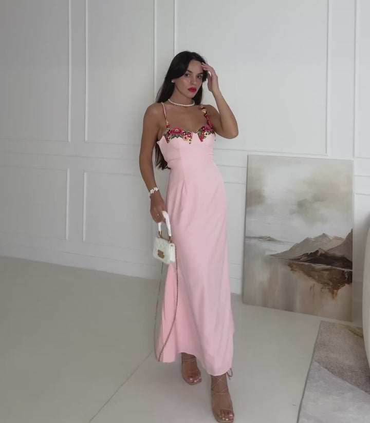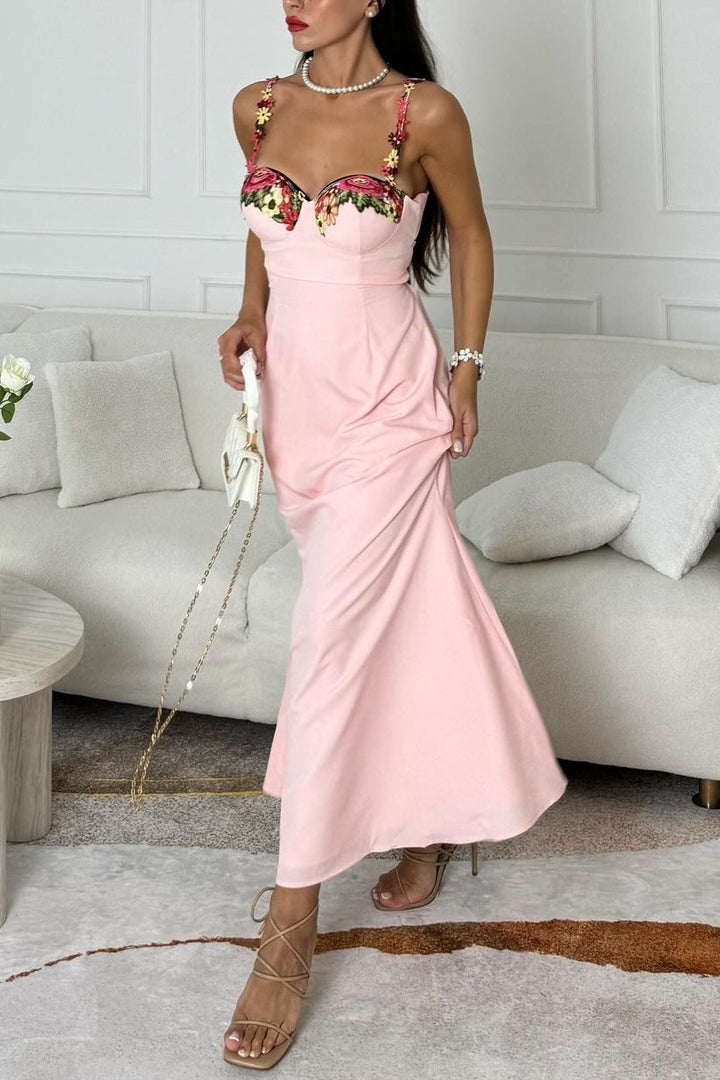 Experience delight in simplicity and charm with our Esne Flower Halter Maxi Dress! The Esne Flower Halter Maxi Dress showcases a flattering fitted silhouette adorned with delicate floral embroidery on the shoulder straps. It exudes romantic charm, perfect for special occasions. Complete the look with dainty gold jewelry and strappy sandals for an elegant touch.