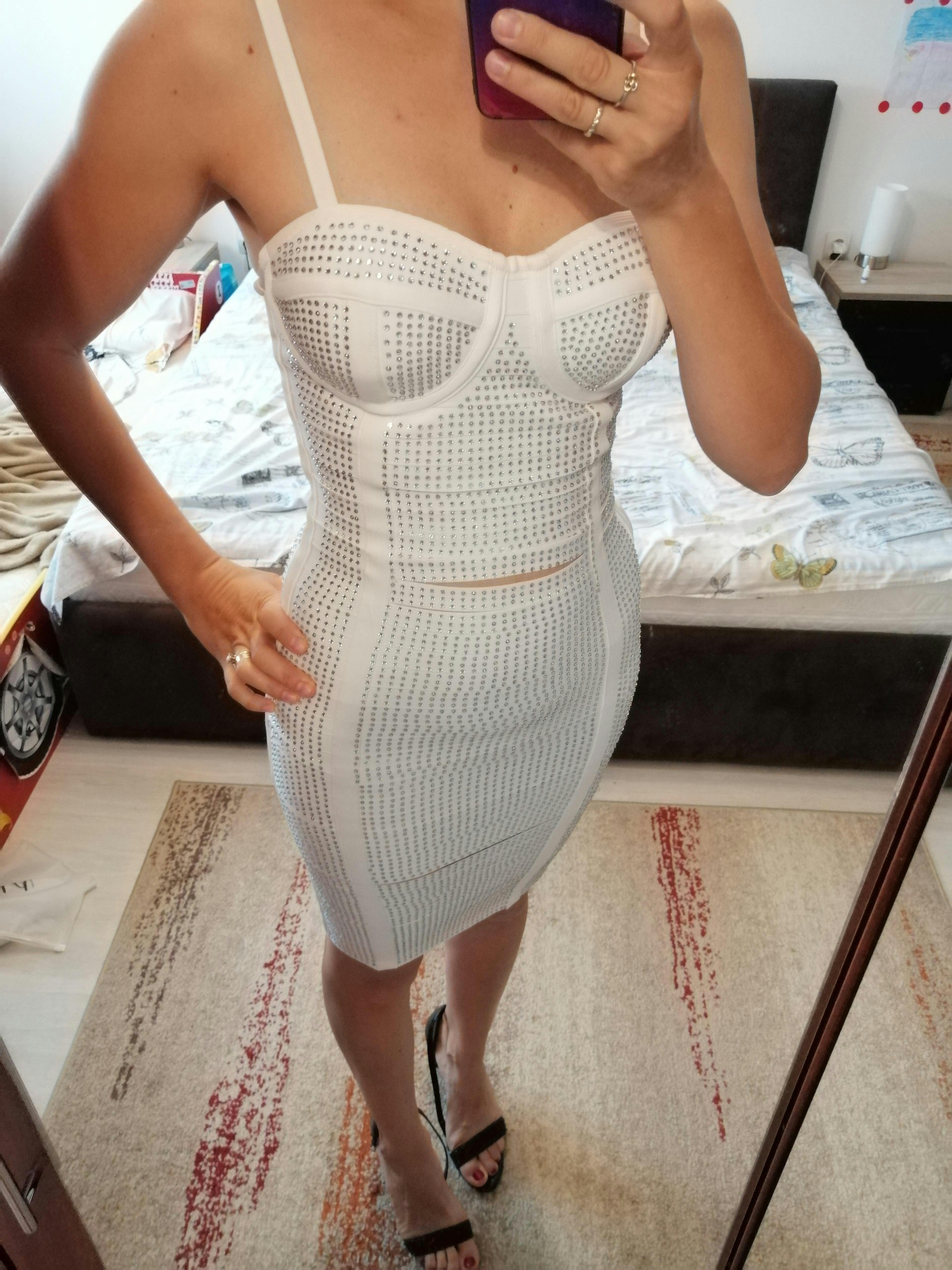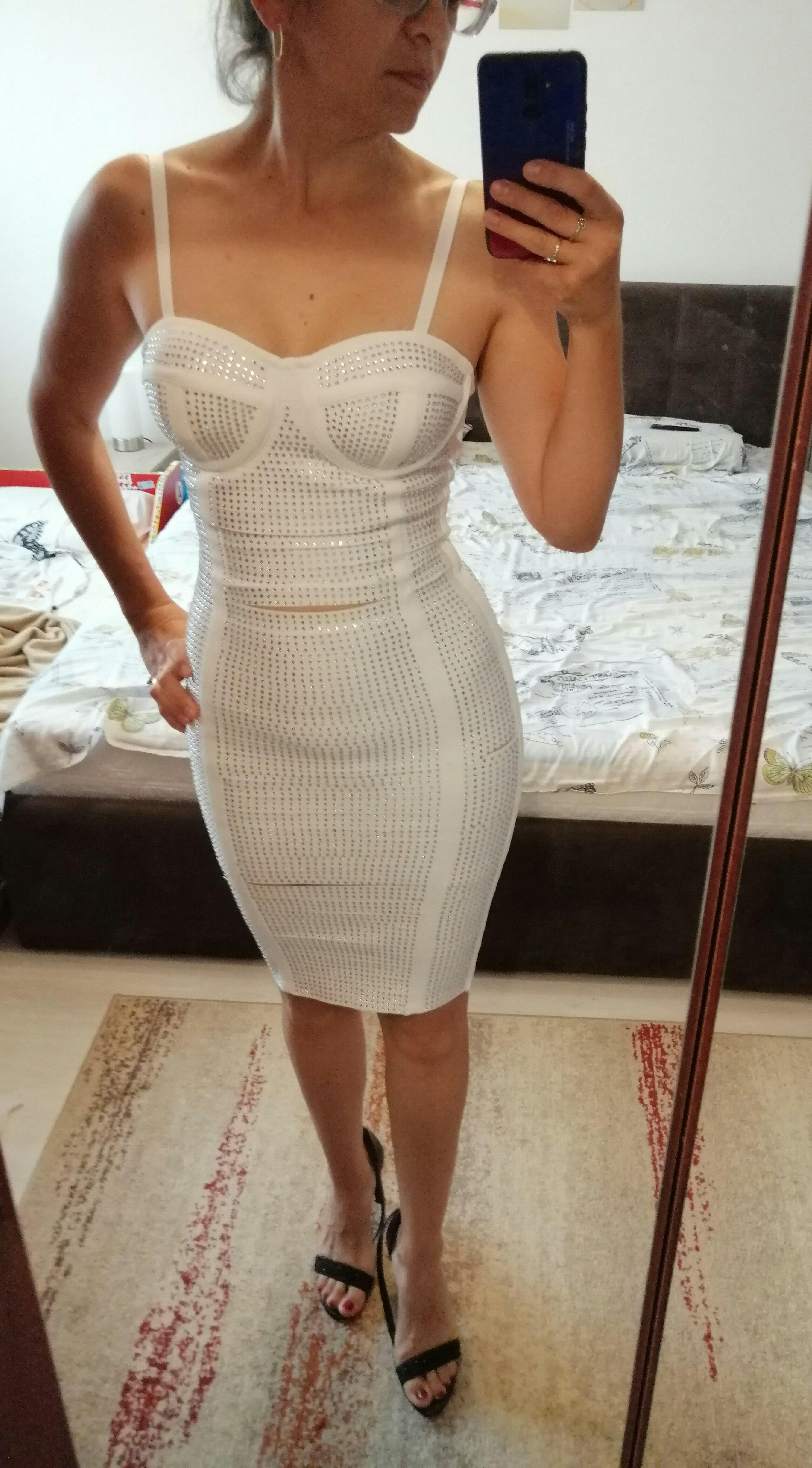 The remarkable Euopa Diamonate Mini Bandage Dress is the perfect frock for any occasion! It's crafted from bandage fabric to sculpt and shape the figure, acting like shape wear that is cleverly built into the dress. Pair with stilettos and your favourite mini bag for an unforgettable look.