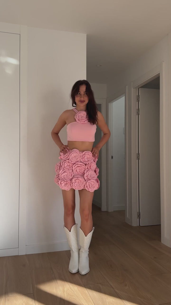 Our Ezgi Flower Halter Top Mini Skirt Set, adorned with pink flowers, perfect for your next night out! This set combines playful femininity with modern style, featuring a halter top adorned with 3D floral details and a chic mini skirt that complements the top perfectly. Accessorize with delicate sandals and elegant drop earrings to complete the look.
