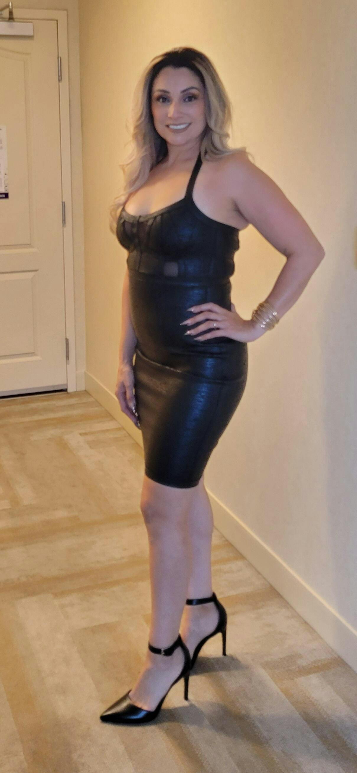 We can't have a new collection without some bandages. Made with our new coated bandage this form-fitting bodycon has a wet leather effect, the new design has a sweetheart neckline and built-in cups for support. The sheer panels add a modest nude illusion while the draping armbands add an elegant touch. Pair with our favorite black pumps and let this cocktail party dress stand out on its own.