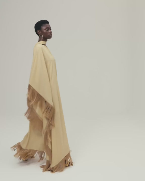 The Hammamet is a relaxed-fit. It features a softly rounded neckline with a subtle V-slit, offering a refined yet effortless charm. Fully trimmed with tonal soft fringes, it is finished with our signature attached fringed scarf that completes the neckline, adding movement and a laid-back attitude to the garment.