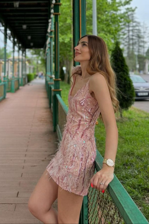 Glow on, girl in this party dress will bring the shimmer and glamour to the beautiful night! Klauda Pink Mini Dress begins with V neckline that flows into a bodycon silhouette. We are completing the look with shiny earrings and heels.