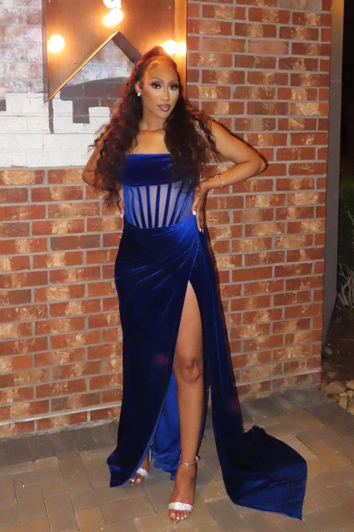 Lamva Corset Velvet Slit Maxi Dress - Blue
