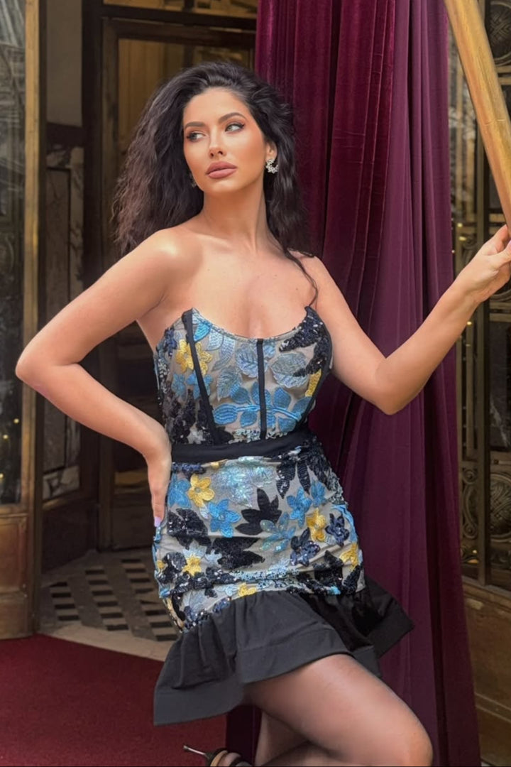 The Liwisy Off Shoulder Sequin Dress is always a stunner! Sheer mesh, embellished with floral embroidery and shiny sequins, darted bodice, and curve-hugging bodycon mini skirt. It's time to take your style to new heights in this party dress.