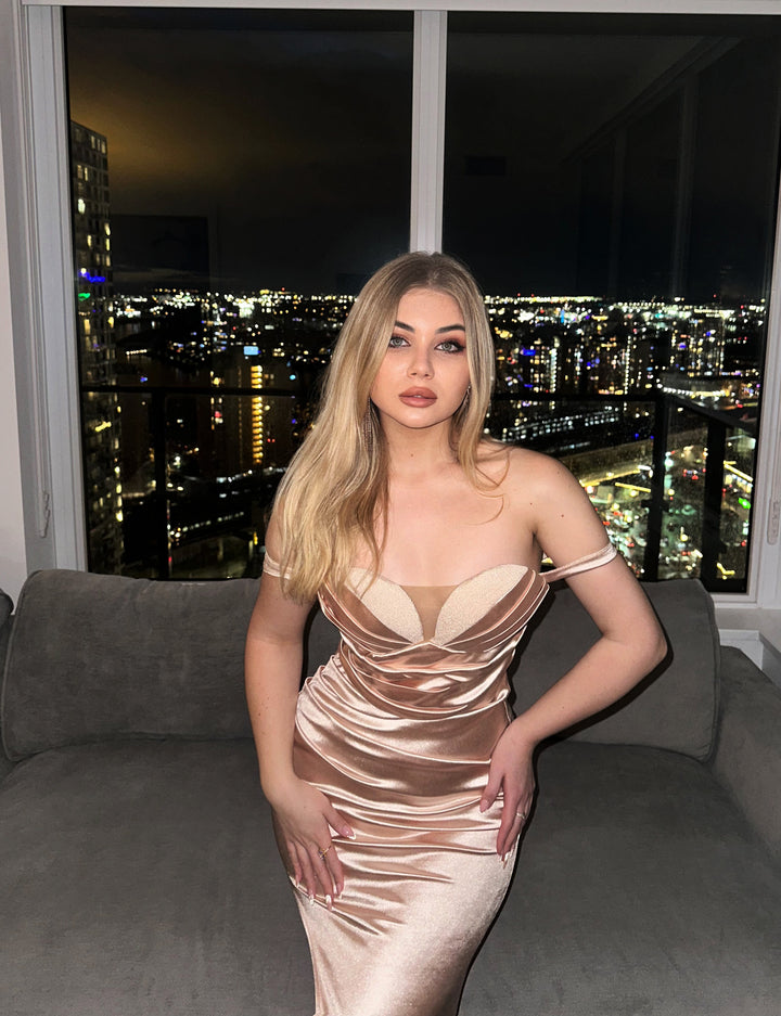 Experience unforgettable elegance with our Magdalena Off-Shoulder Pleated Slit Maxi Dress! Crafted in luxurious champagne satin, this dress exudes sophistication through its off-shoulder design and delicate pleats. The side slit adds a hint of mystery and allure, making it the perfect choice for evening galas and special occasions. Pair it with sparkling earrings and a delicate clutch to elevate your sophisticated charm.