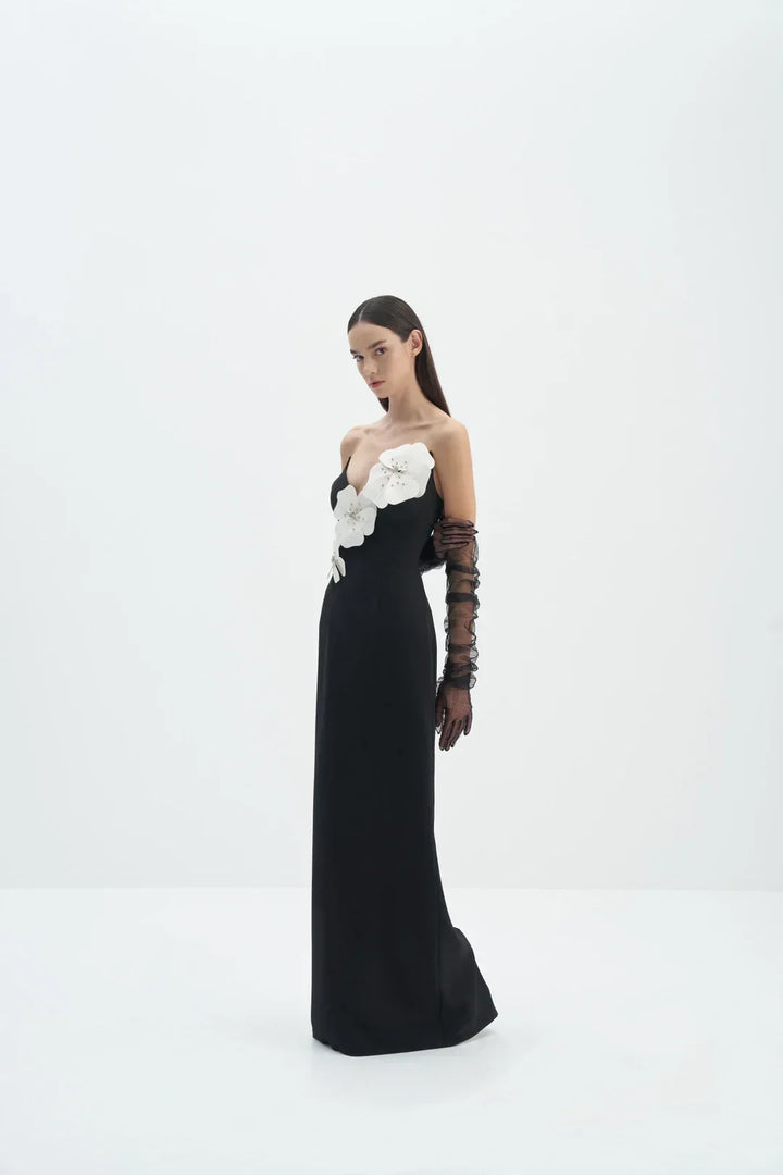 This dress is a special design. The flowers on the front are handmade. It is an elegant design that will accompany you on your special occasions.