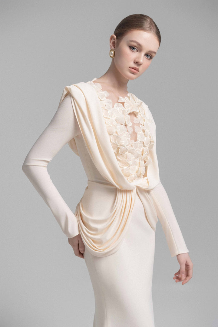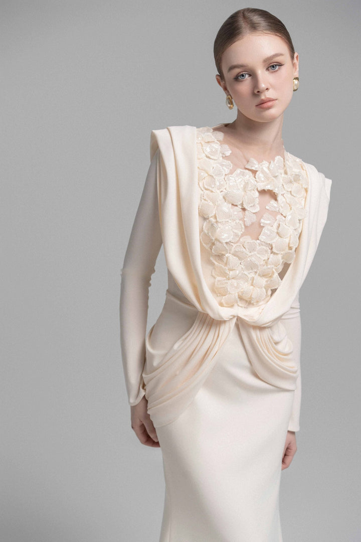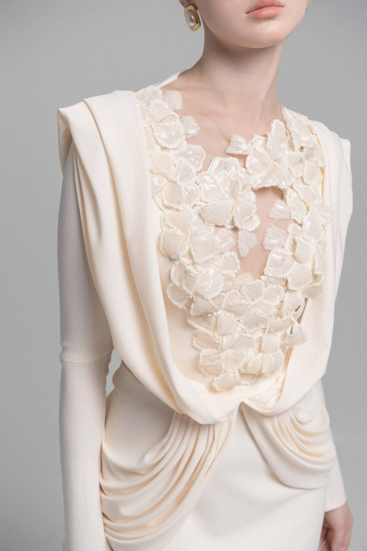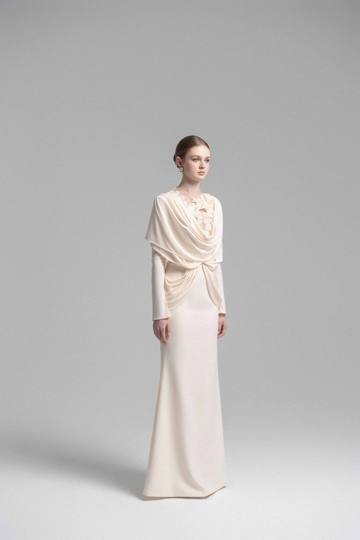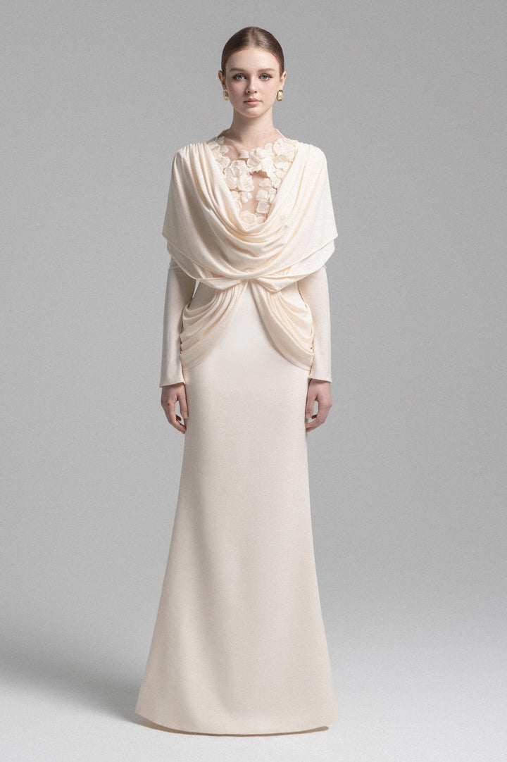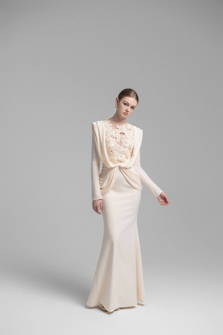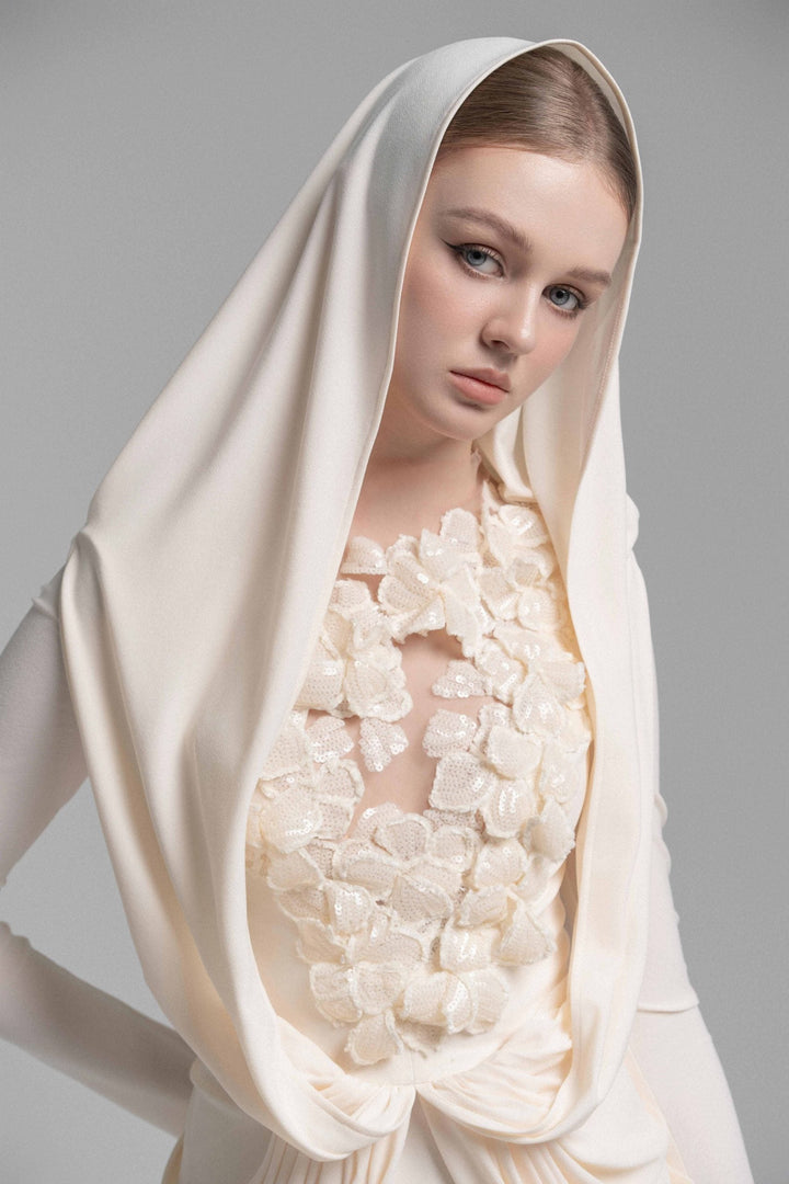A mermaid midi dress with a soft draped hood, pleated waist, and sheer lace- appliqué detailing on the bodice.