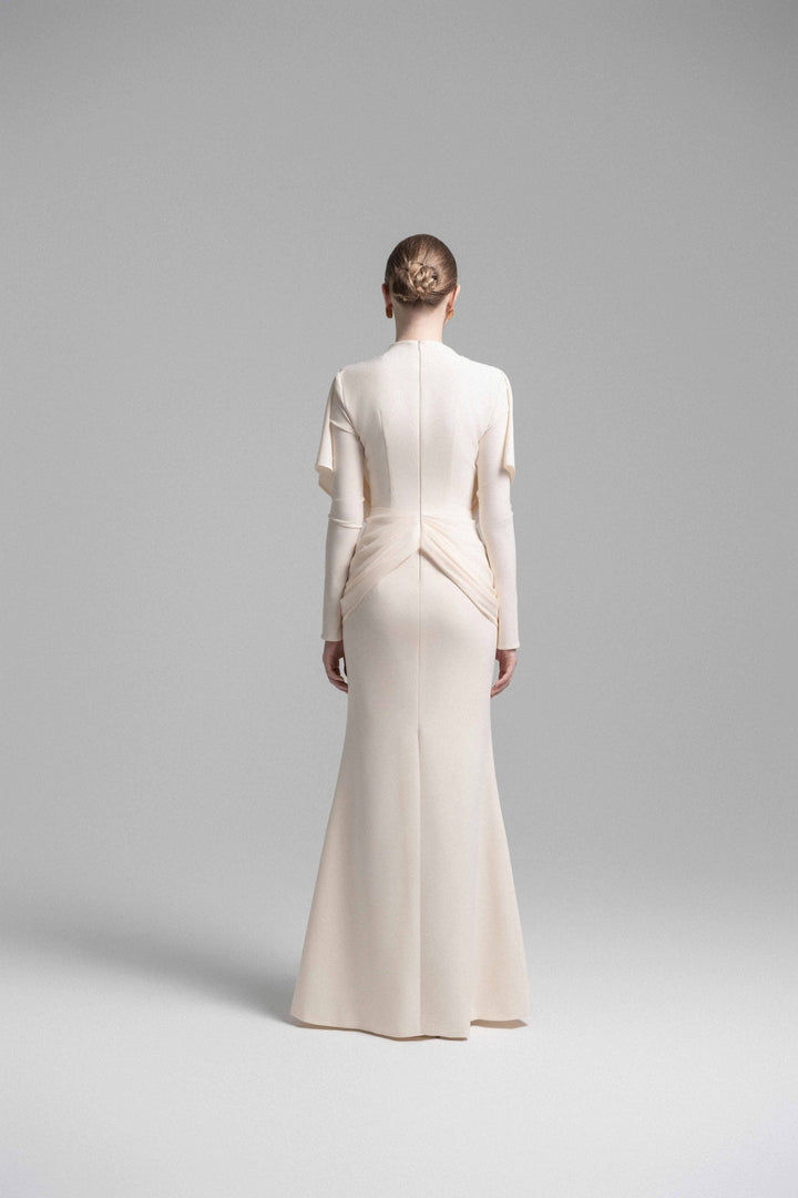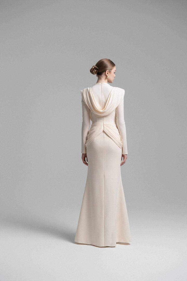 This mermaid dress features a soft draped hood for a fresh, elegant look. The pleated waist defines your shape, creating a