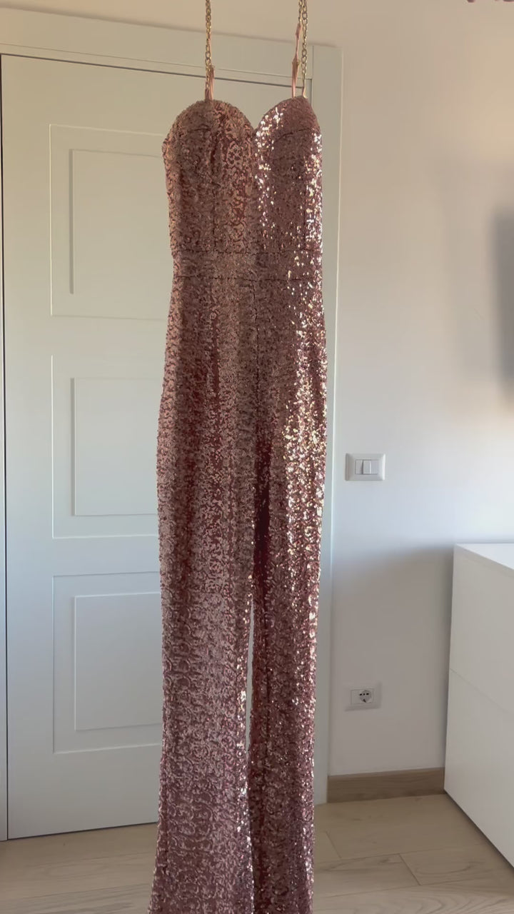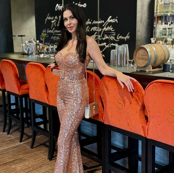 With the Natalie Sequin Jumpsuit, you are the embodiment of opulence and grace. This jumpsuit is a celebration of shimmer and sophistication, featuring an abundance of champagne-colored sequins that catch the light with every step you take. The jumpsuit's tailored silhouette exudes confidence and style, while the sweat heart neckline adds a touch of allure. Pair the jumpsuit with strappy metallic heels to elevate your style and add a touch of sophistication.