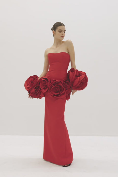 This red strapless dress features a sleek column silhouette, accentuated by oversized, sculptural roses encircling the hips for a dramatic and artistic touch. The unique floral detail adds a statement-making element to the minimalist design.
