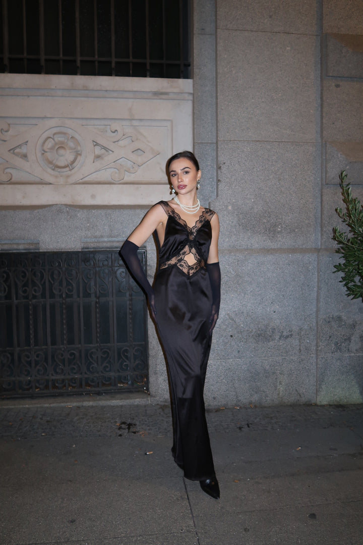 Be the center of socializing in our Pale Lace Cut Out Satin Maxi Dress! This dress blends elegance and allure with its sleek satin fabric and intricate lace cut-out detailing. The bodice of the dress is expertly crafted to resemble a black butterfly, while the simple and slender hemline adds a touch of sophistication. Pair it with delicate jewelry and sleek heels for a refined and glamorous look that will turn heads.