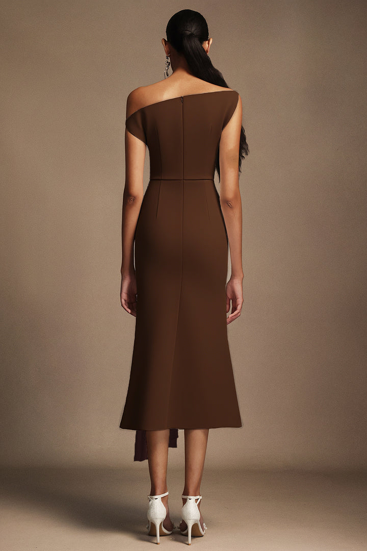 Paulina Oblique Shoulder Sleeveless Folds Brown Midi Dress