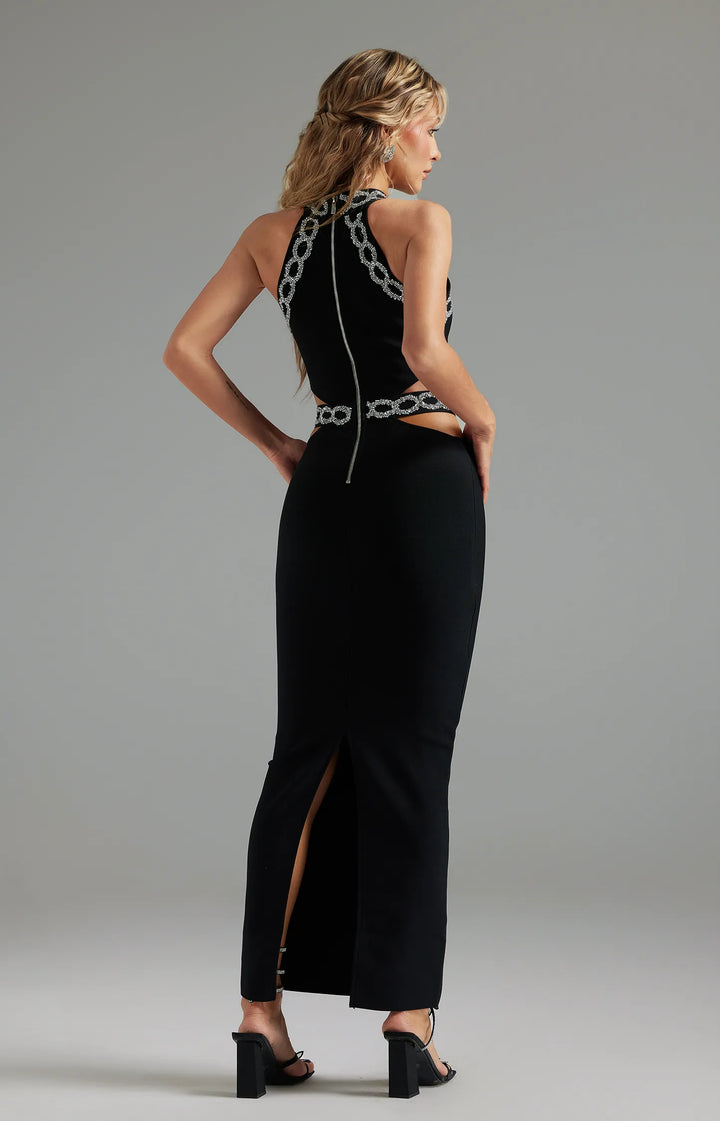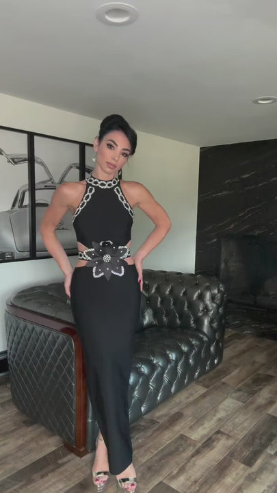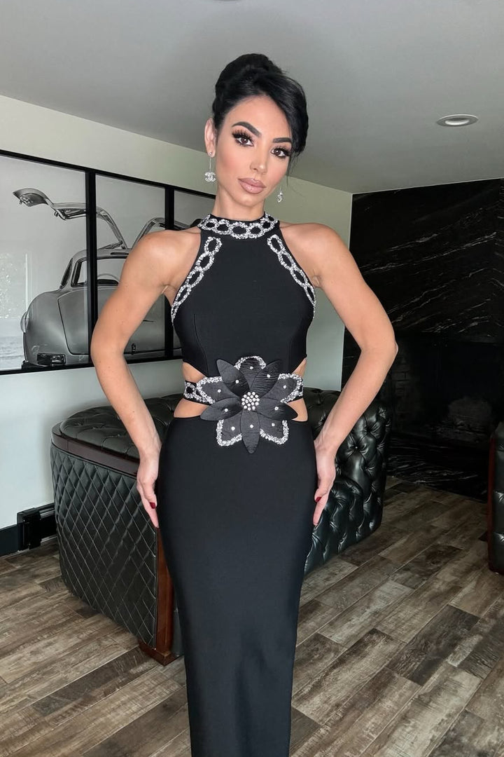Stride into the night with elegance in our Perrine Glitter Cut-Out Bandage Maxi Dress! The Perrine Glitter Cut-Out Bandage Maxi Dress is a striking black dress adorned with sparkling details, featuring intricate cut-outs and a floral waist embellishment. Its fitted silhouette and shimmering accents exude sophistication and grace. Pair it with simple silver jewelry to enhance the dress's sparkle without overpowering its elegance.