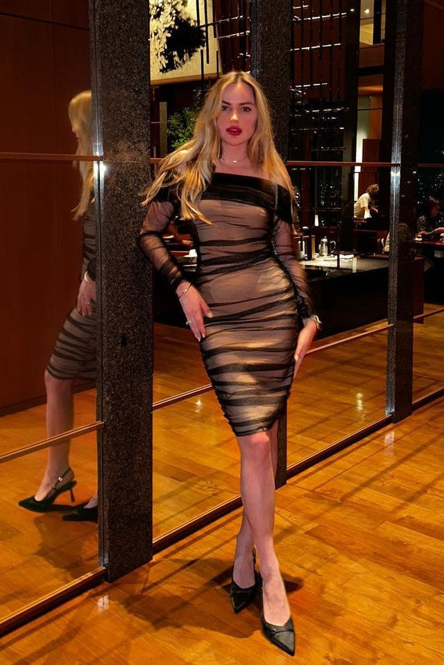 This ultra-luxe Rowena Ruched Mesh Bandage Midi Dress is crafted from a delicate and slightly sheer soft and luxurious ruched tulle. The flattering off-shoulder cut is oh-so-sexy and we love the gentle ruching that extends even to the sleeves. It has a body-hugging fit and a midi length to balance the look. Fully lined by bandage fabric as usual to give a slightly sheer finish. This party dress is just for you,what are you waiting for!