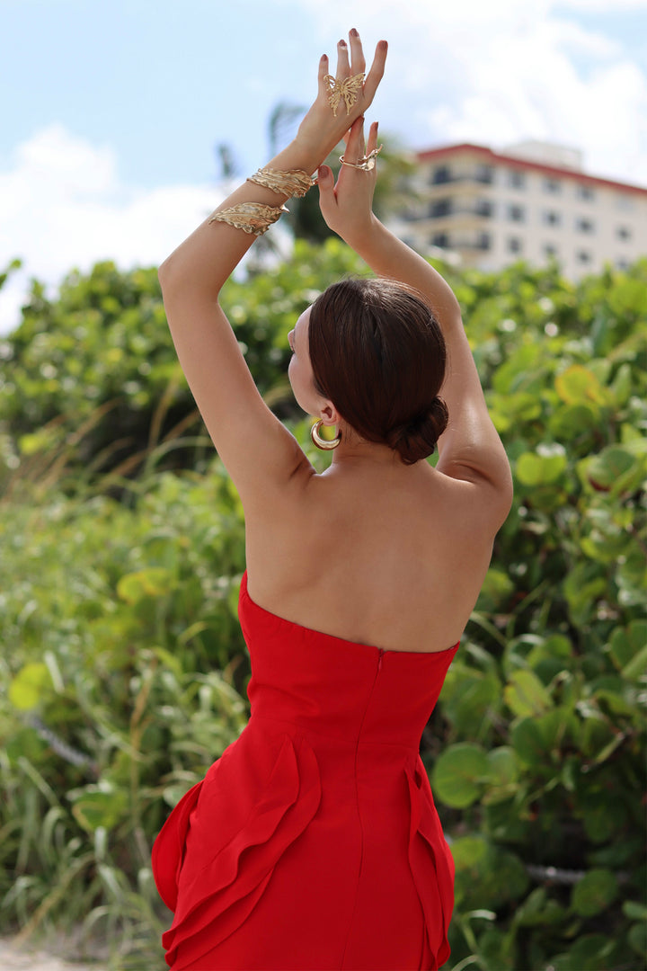 - Get the look: Shaha Flowers Tube Top Mini Dress - Red (The influencer is wearing the same style as this product)