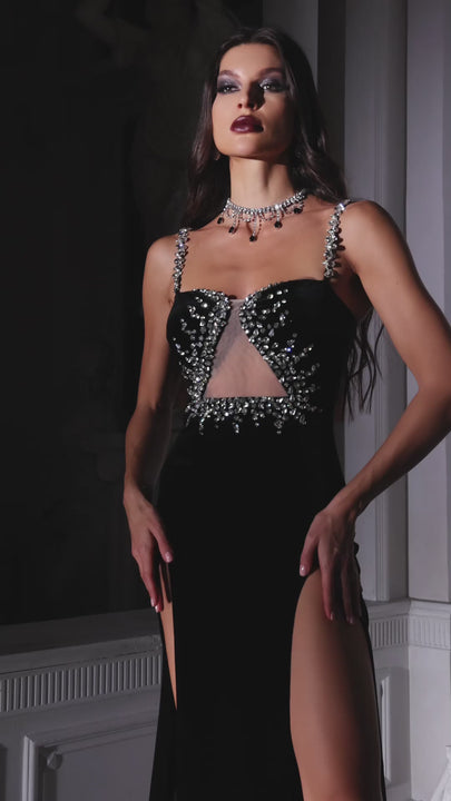 Stand out from the crowd with the Sheath Hot Drills Max Dress, bringing a modern edge to classic elegance! The Sheath Hot Drills Max Dress in black showcases a sleek, form-fitting silhouette adorned with eye-catching hot drills and a double side slit, offering both elegance and a touch of mystery. This dress pairs beautifully with silver or diamond jewelry for added sparkle and sophistication.