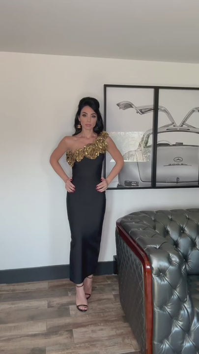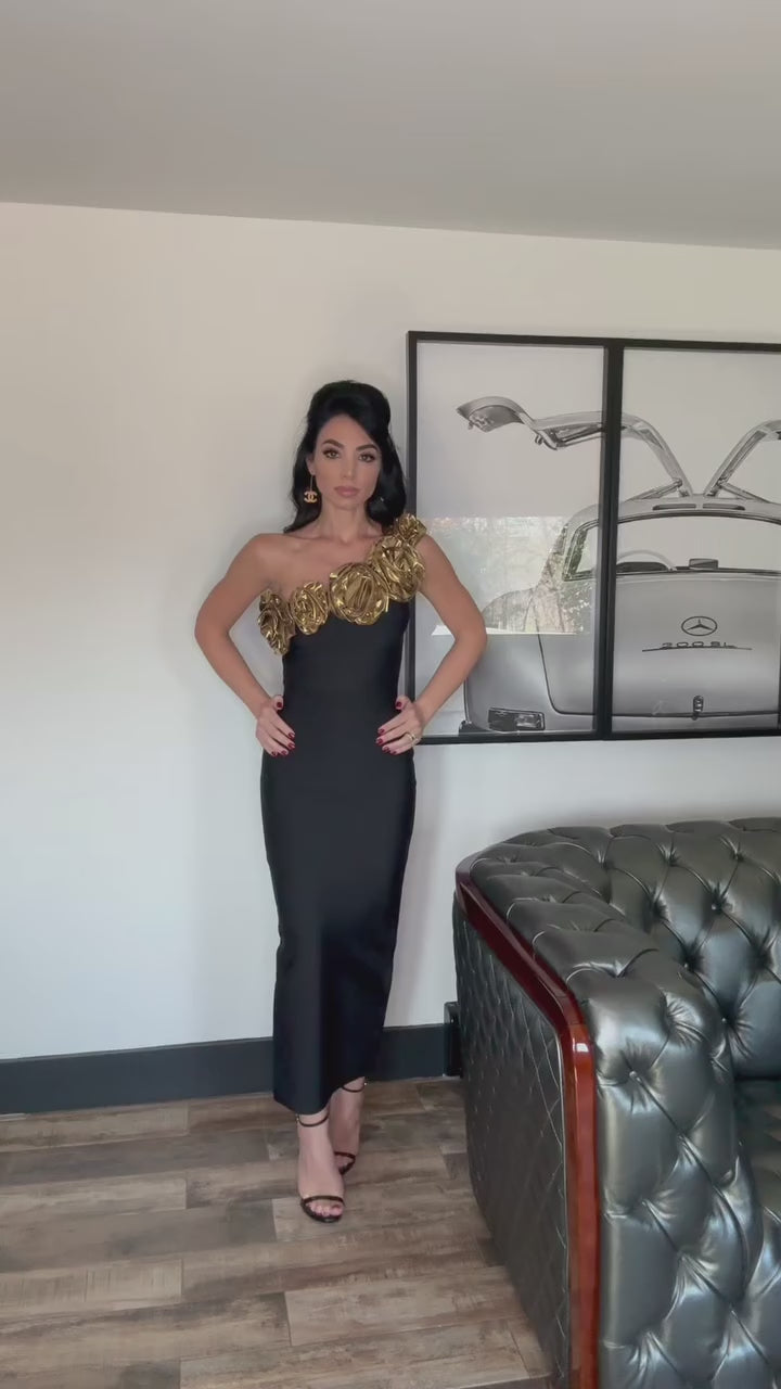 Turn heads and make a statement that lasts with Slaia One Shoulder Flowers Bandage Midi Dress! The Slaia One Shoulder Flowers Bandage Midi Dress features a bold one-shoulder design adorned with gold 3D flowers, adding a luxurious touch. The bandage fit enhances curves, while the midi length balances elegance with allure. Pair with minimalistic gold jewelry and sleek heels for a glamorous finish.