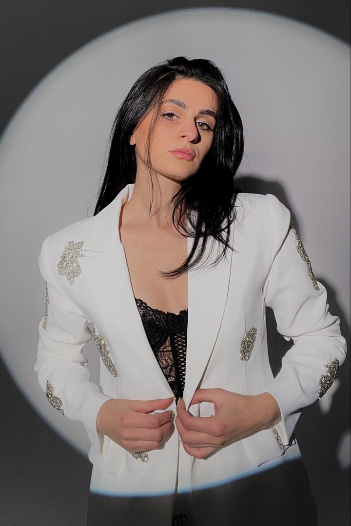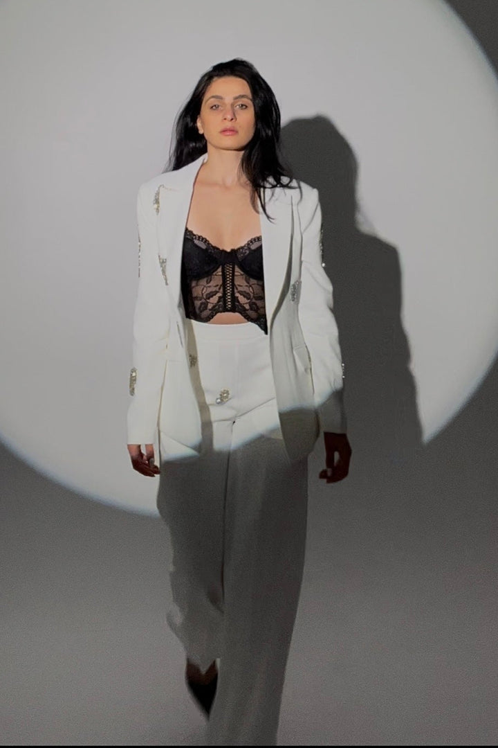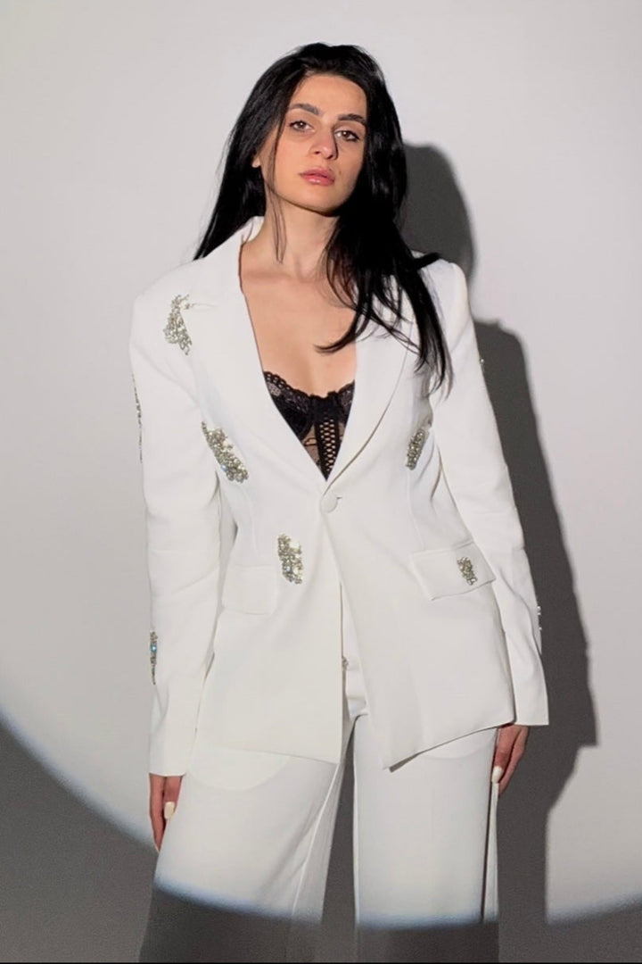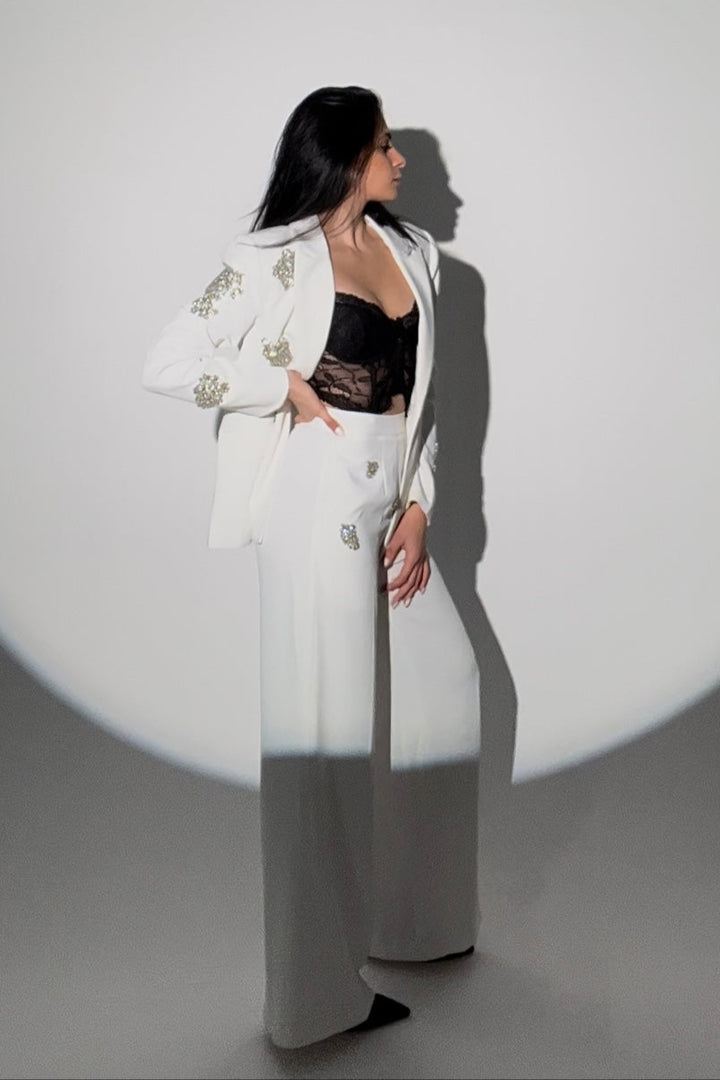 Elevate your wardrobe with our Wine Diamante Blazer Set! It is a stunning blend of elegance and contemporary style. The tailored blazer features eye-catching diamante embellishments that elevate its chic silhouette, and the coordinating trousers ensure a sleek fit. Pair it with delicate gold or silver jewelry to perfectly complement the dazzling diamante accents, making it the perfect choice for any professional setting or evening event.