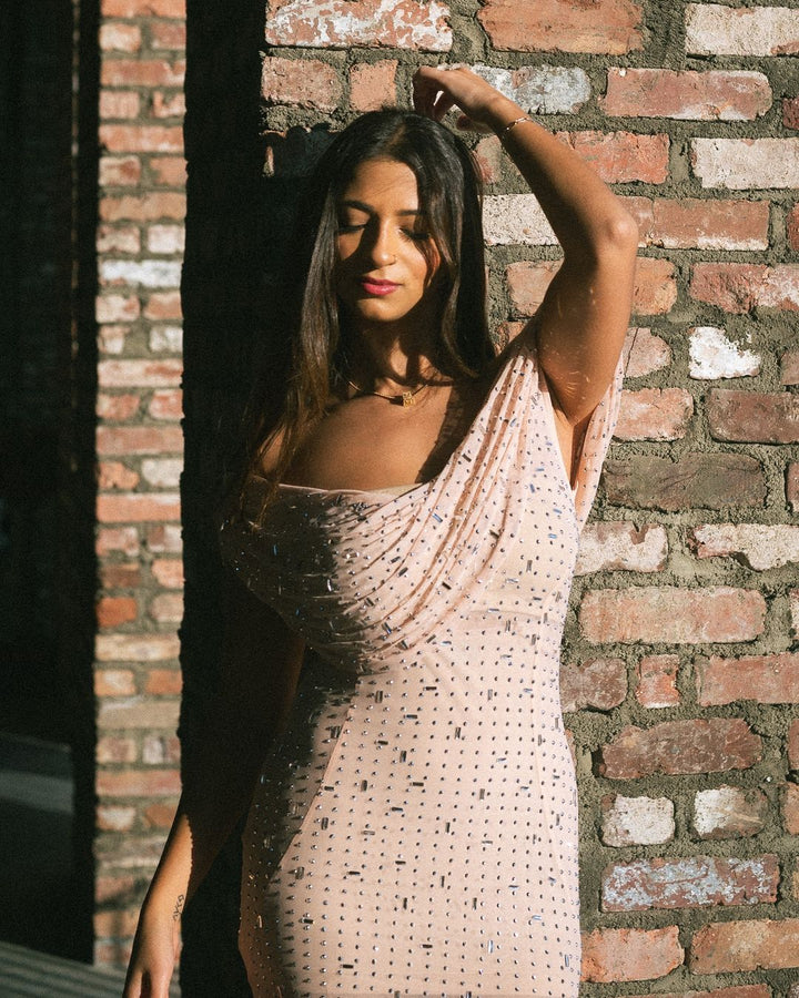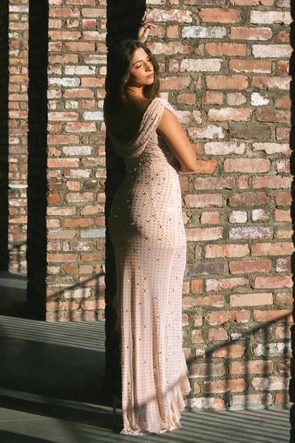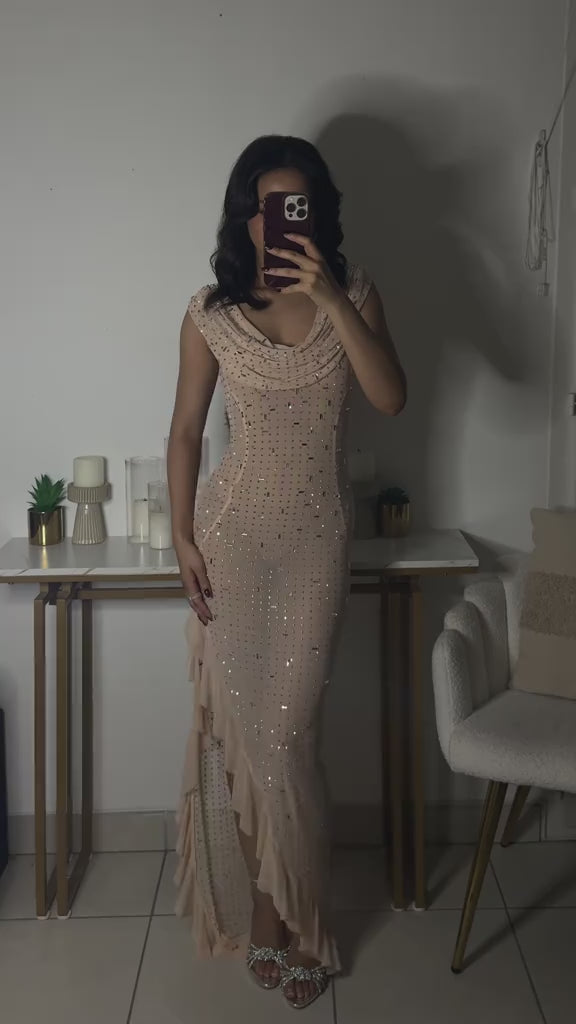 Xacier Diamante Mesh Slit Dress